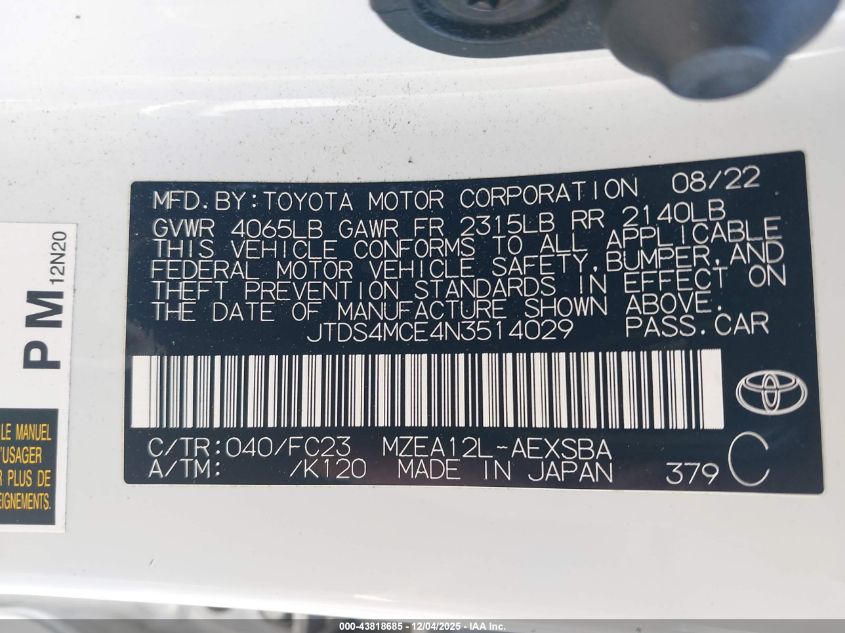 2022 TOYOTA COROLLA 2022 року Бензин, 2.0, Передний привод, vin - JTDS4MCE4N3514029 из США