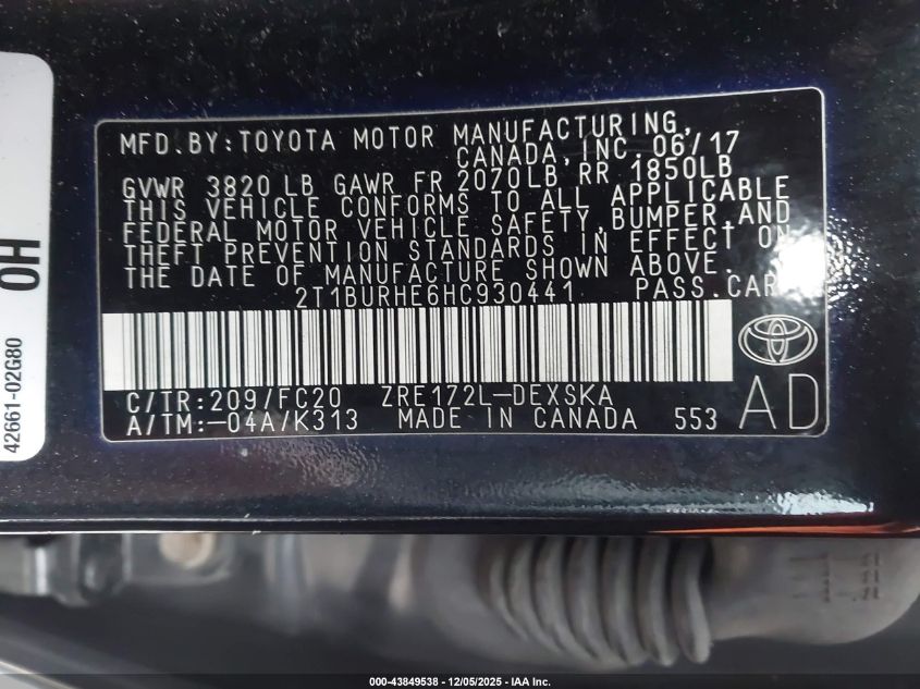 2017 TOYOTA COROLLA 2017 року Бензин, 1.8, Передний привод, vin - 2T1BURHE6HC930441 из США