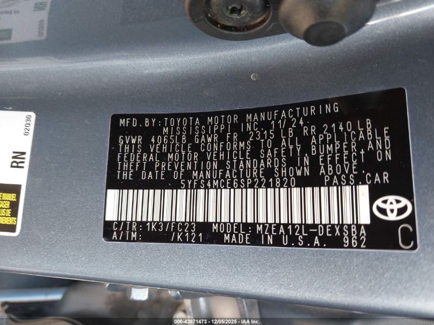 2025 TOYOTA COROLLA 2025 року Бензин, 2.0, Передний привод, vin - 5YFS4MCE6SP221820 из США