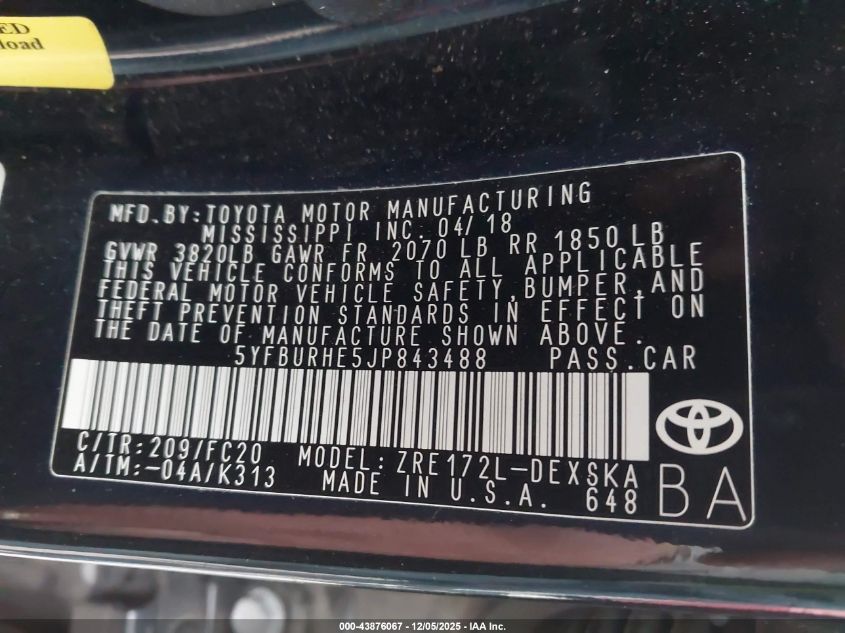 2018 TOYOTA COROLLA 2018 року Бензин, 1.8, Передний привод, vin - 5YFBURHE5JP843488 из США