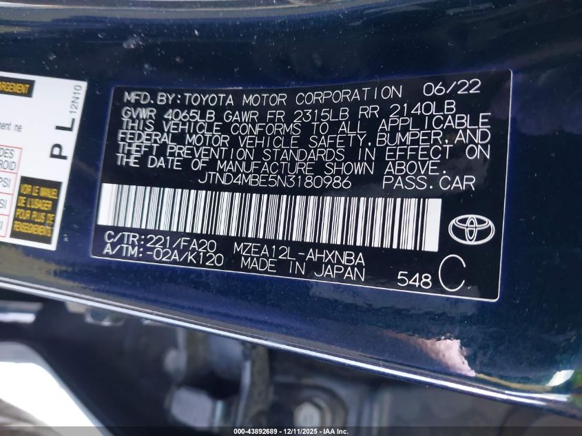 2022 TOYOTA COROLLA 2022 року Бензин, 2.0, Передний привод, vin - JTND4MBE5N3180986 из США