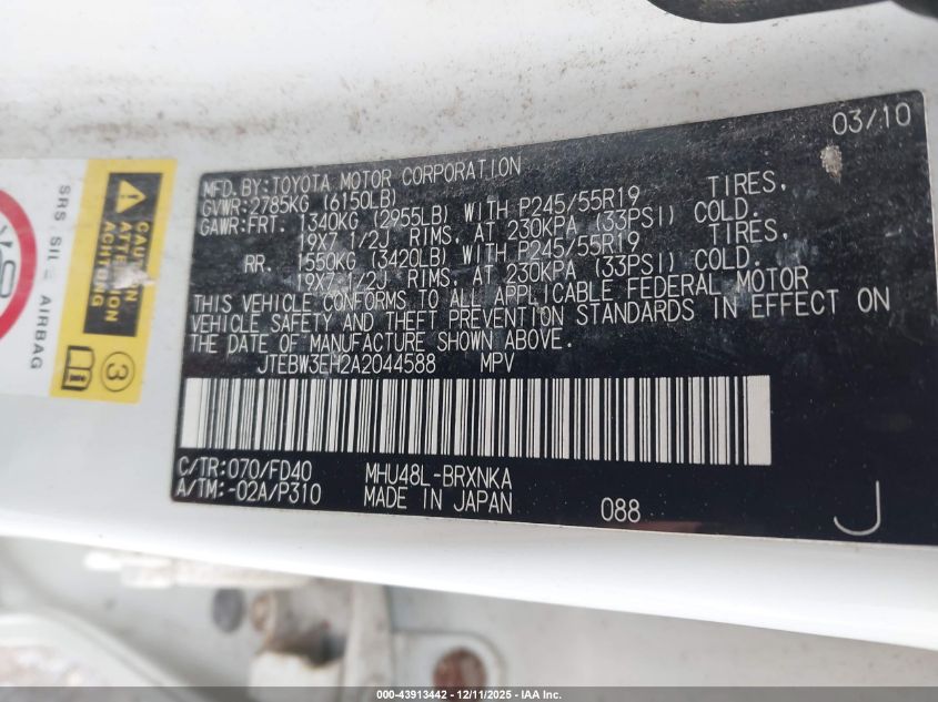 Цвет БелыйЦилиндры 6Привод Полный приводVIN JTEBW3EH2A2044588Состояние Заводится и едет (проверено)Повреждения Передняя или задняяДата аукциона 2025-12-18 AutoRIA