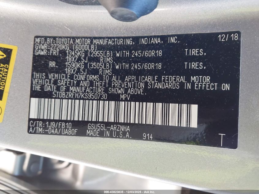 2019 TOYOTA HIGHLANDER 2019 року Бензин, 3.5, Полный привод, vin - 5TDBZRFH7KS950730 из США