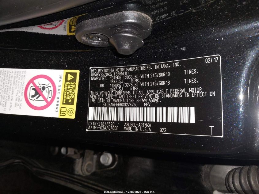 2017 TOYOTA HIGHLANDER 2017 року Бензин, 2.7, Передний привод, vin - 5TDZARFH6HS027475 из США