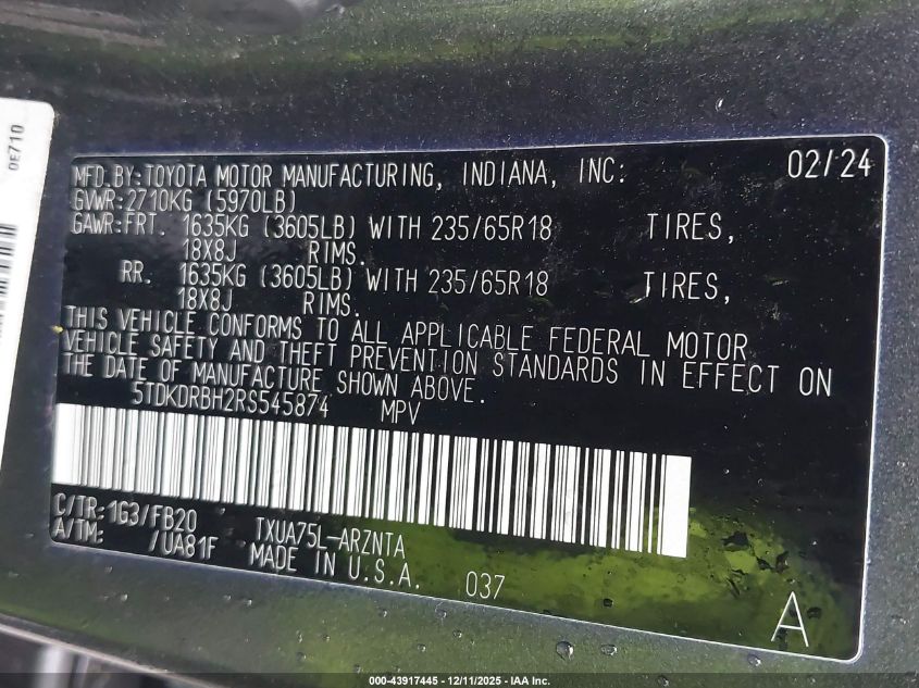 2024 TOYOTA HIGHLANDER 2024 року Бензин, 2.4, Полный привод, vin - 5TDKDRBH2RS545874 из США