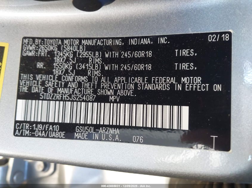 2018 TOYOTA HIGHLANDER 2018 року Бензин, 3.5, Передний привод, vin - 5TDZZRFH5JS254087 из США