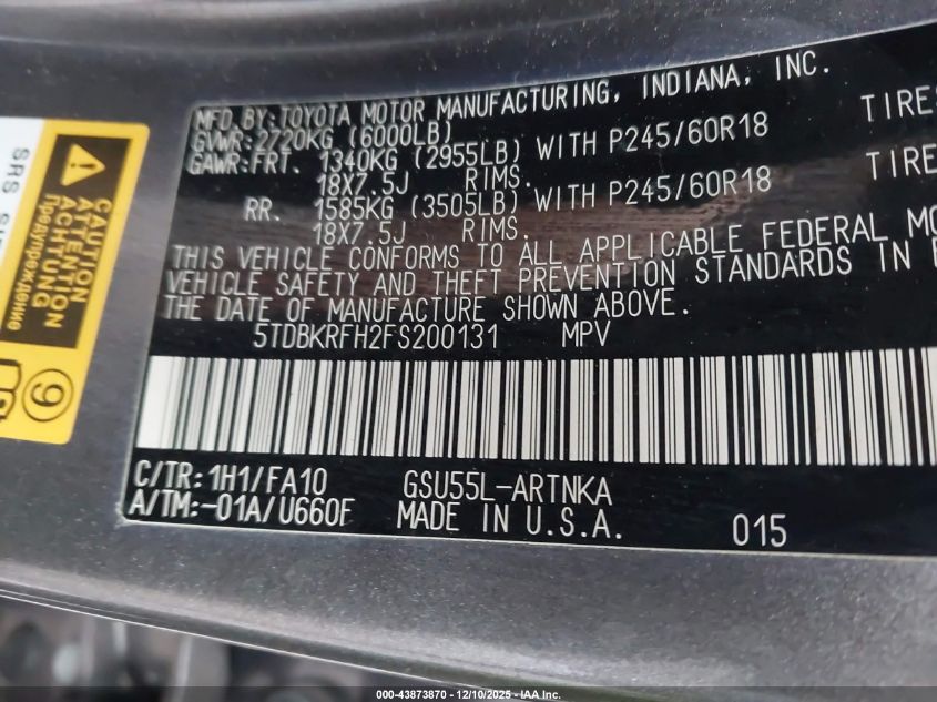 Цвет СерыйЦилиндры 6Привод Полный приводVIN 5TDBKRFH2FS200131Состояние СтационарноПовреждения Передняя или задняя AutoRIA