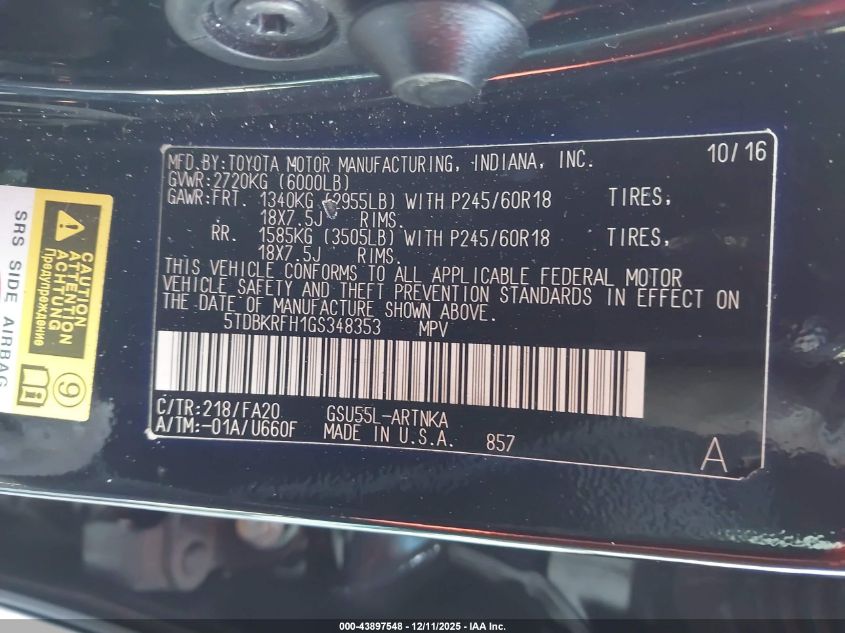 2016 TOYOTA HIGHLANDER 2016 року Бензин, 3.5, Полный привод, vin - 5TDBKRFH1GS348353 из США