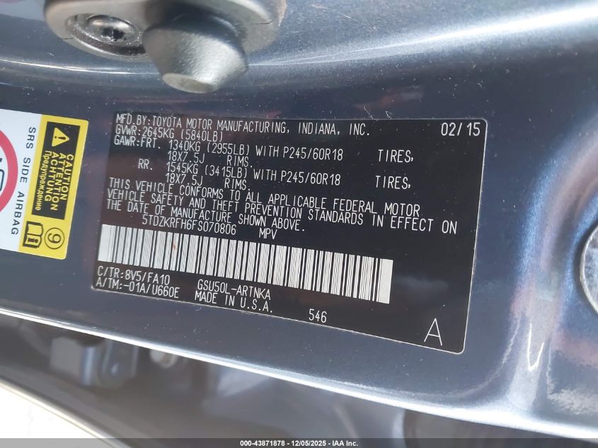 2015 TOYOTA HIGHLANDER 2015 року Бензин, 3.5, Передний привод, vin - 5TDZKRFH6FS070806 из США