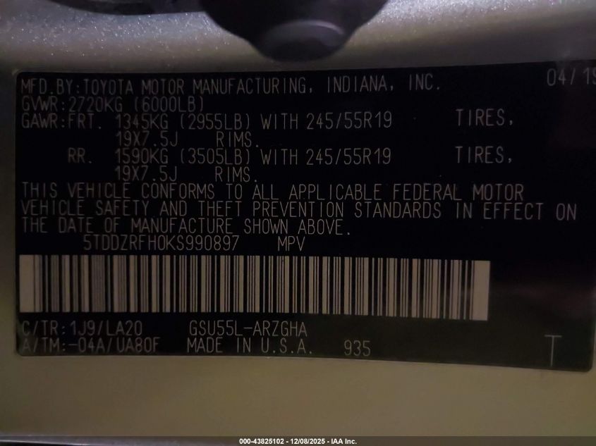 2019 TOYOTA HIGHLANDER 2019 року Бензин, 3.5, Полный привод, vin - 5TDDZRFH0KS990897 из США