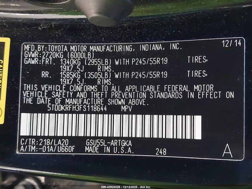 2015 TOYOTA HIGHLANDER 2015 року Бензин, 3.5, Полный привод, vin - 5TDDKRFH3FS118644 из США