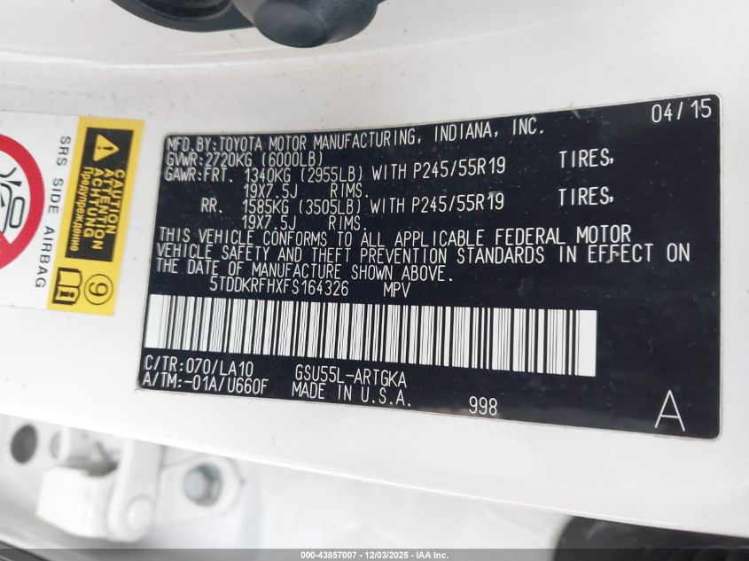 2015 TOYOTA HIGHLANDER 2015 року Бензин, 3.5, Полный привод, vin - 5TDDKRFHXFS164326 из США
