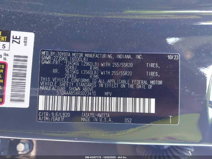 2024 TOYOTA HIGHLANDER 2024 року Бензин, 2.4, Полный привод, vin - 5TDAAAB58RS023410 из США