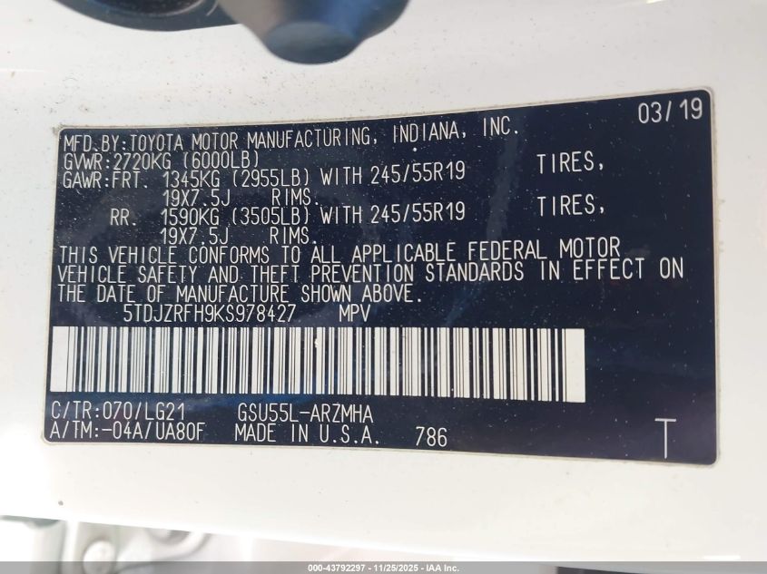 2019 TOYOTA HIGHLANDER 2019 року Бензин, 3.5, Полный привод, vin - 5TDJZRFH9KS978427 из США