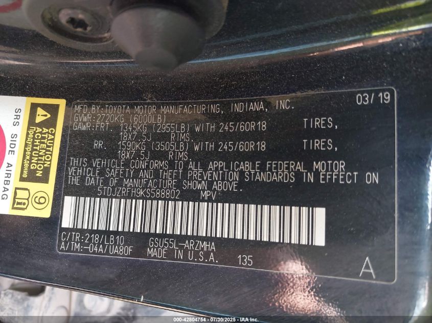 2019 TOYOTA HIGHLANDER 2019 року Бензин, 3.5, Полный привод, vin - 5TDJZRFH9KS588802 из США