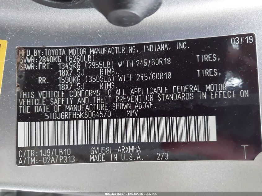 2019 TOYOTA HIGHLANDER 2019 року Гибрид, 3.5, Полный привод, vin - 5TDJGRFH5KS064570 из США