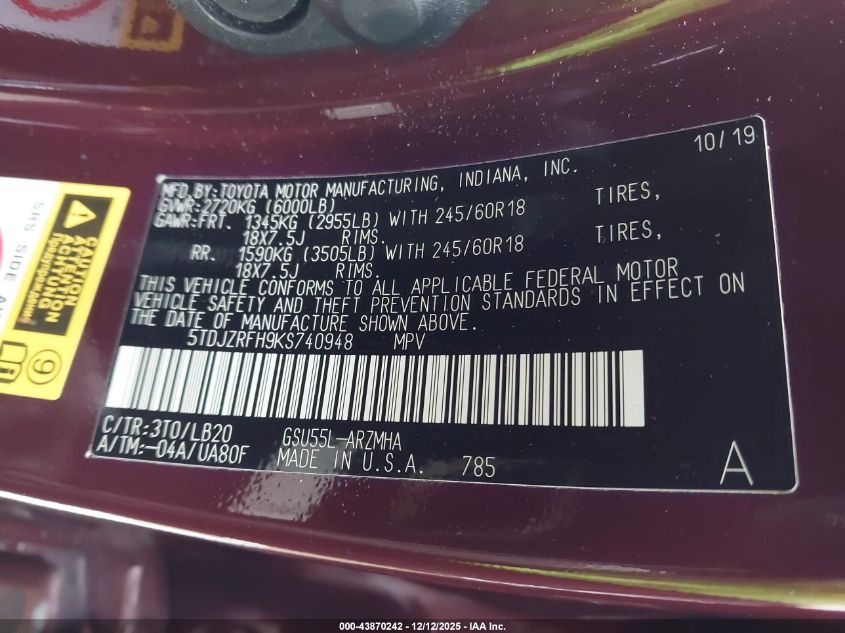 2019 TOYOTA HIGHLANDER 2019 року Бензин, 3.5, Полный привод, vin - 5TDJZRFH9KS740948 из США