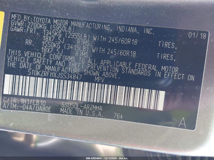 2018 TOYOTA HIGHLANDER 2018 року Бензин, 3.5, Передний привод, vin - 5TDKZRFHXJS534847 из США