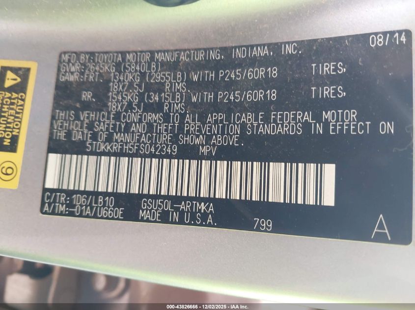 2015 TOYOTA HIGHLANDER 2015 року Бензин, 3.5, Передний привод, vin - 5TDKKRFH5FS042349 из США