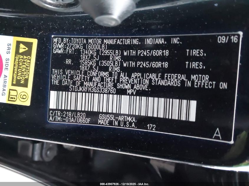 2016 TOYOTA HIGHLANDER 2016 року Бензин, 3.5, Полный привод, vin - 5TDJKRFH3GS338760 из США