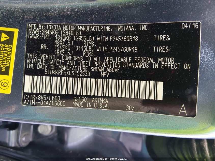 2016 TOYOTA HIGHLANDER 2016 року Бензин, 3.5, Передний привод, vin - 5TDKKRFHXGS152539 из США