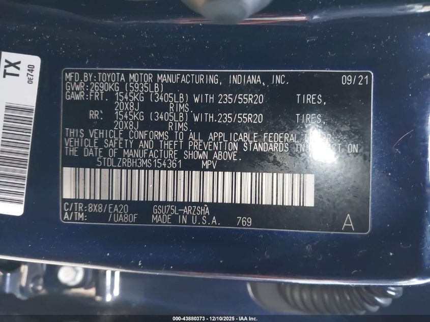2021 TOYOTA HIGHLANDER 2021 року Бензин, 3.5, Полный привод, vin - 5TDLZRBH3MS154361 из США