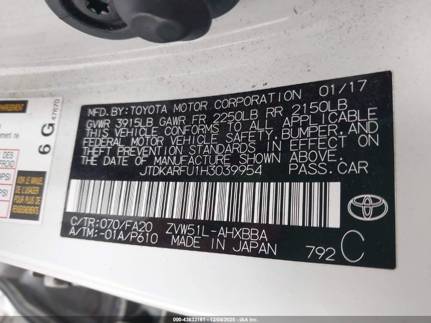 Цвет БелыйЦилиндры 4Привод Передний приводVIN JTDKARFU1H3039954Состояние Заводится и едет (проверено)Повреждения Неизвестно AutoRIA