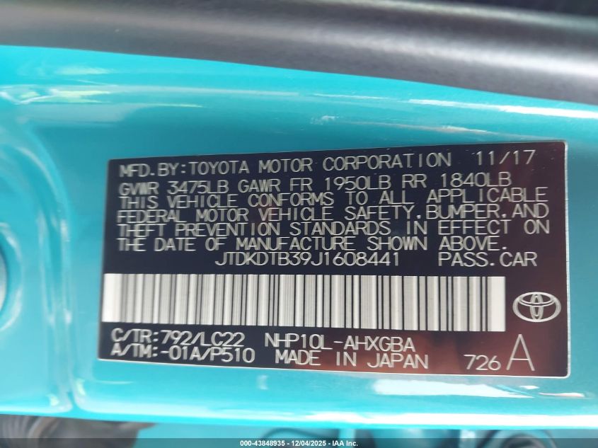 2018 TOYOTA PRIUS C 2018 року Гибрид, 1.5, Передний привод, vin - JTDKDTB39J1608441 из США