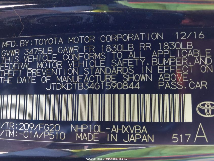 2016 TOYOTA PRIUS C 2016 року Гибрид, 1.5, Передний привод, vin - JTDKDTB34G1590844 из США
