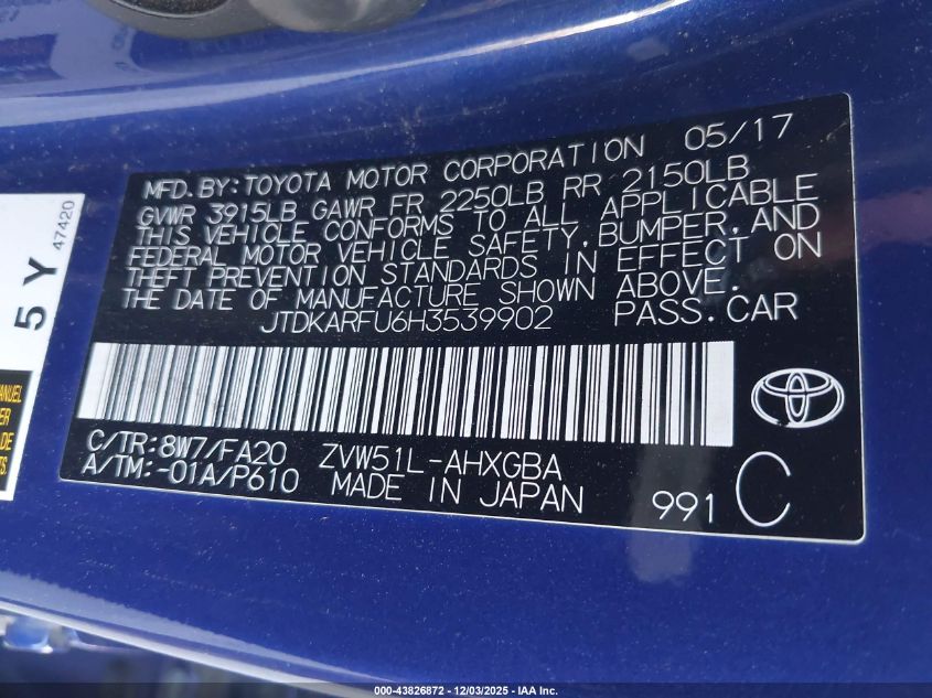 2017 TOYOTA PRIUS 2017 року Гибрид, 1.8, Передний привод, vin - JTDKARFU6H3539902 из США