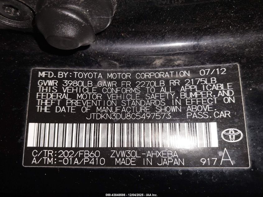 2012 TOYOTA PRIUS 2012 року Гибрид, 1.8, Передний привод, vin - JTDKN3DU8C5497573 из США