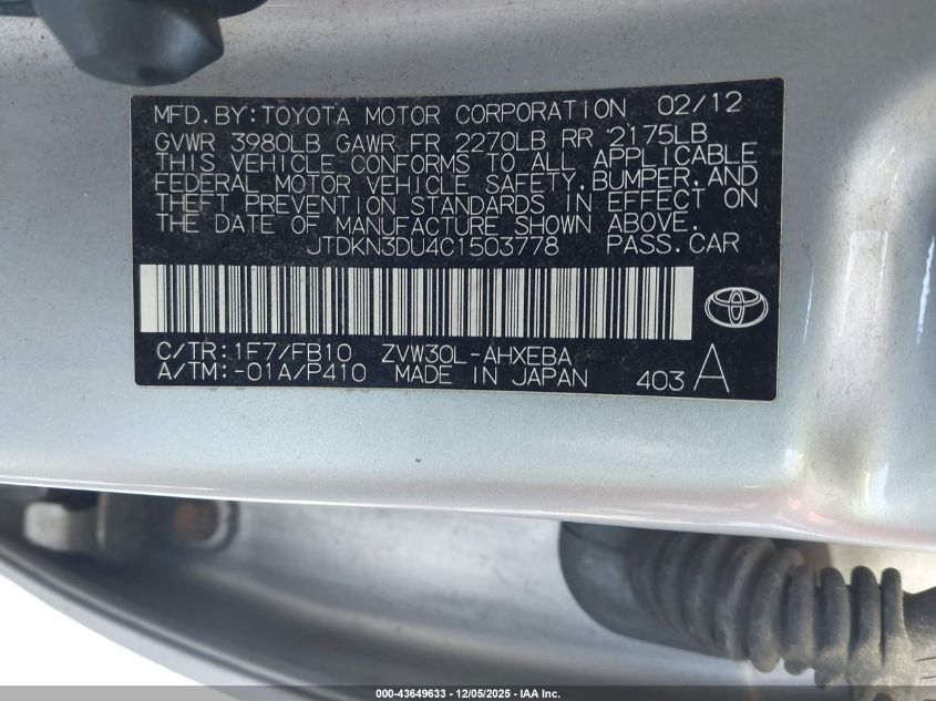 2012 TOYOTA PRIUS 2012 року Гибрид, 1.8, Передний привод, vin - JTDKN3DU4C1503778 из США