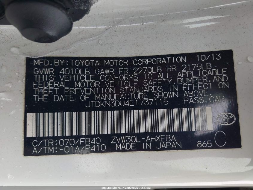 Цвет БелыйЦилиндры 4Привод Передний приводVIN JTDKN3DU4E1737115Состояние СтационарноПовреждения Передняя или задняя AutoRIA