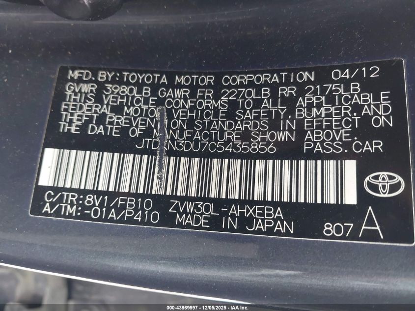 2012 TOYOTA PRIUS 2012 року Гибрид, 1.8, Передний привод, vin - JTDKN3DU7C5435856 из США