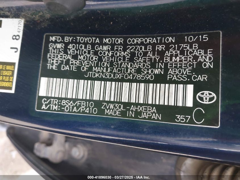 2015 TOYOTA PRIUS 2015 року Гибрид, 1.8, Передний привод, vin - JTDKN3DUXF0478590 из США