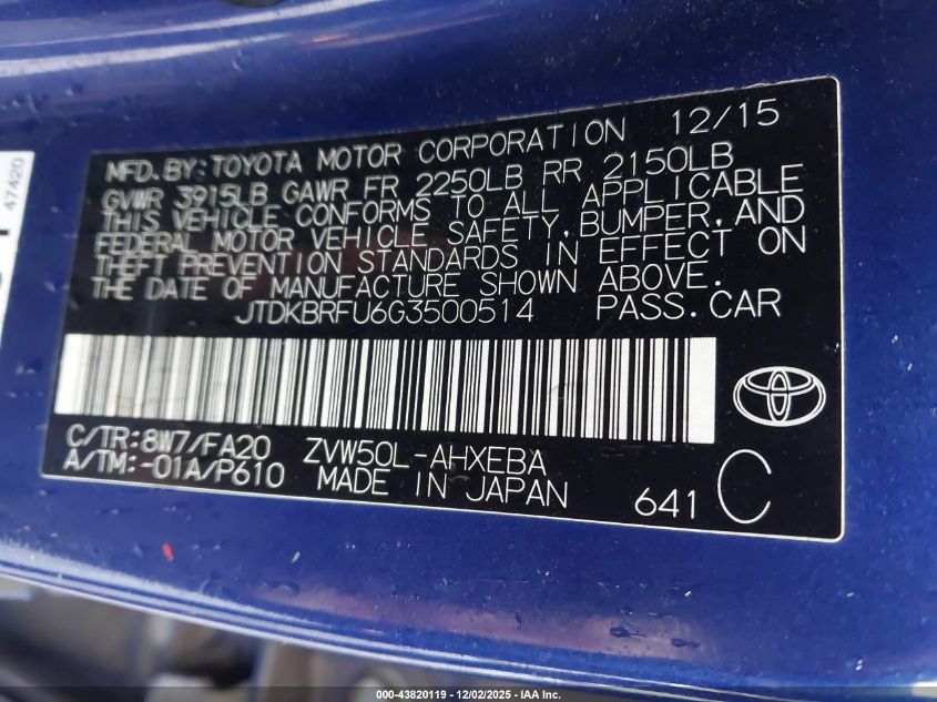 2016 TOYOTA PRIUS 2016 року Гибрид, 1.8, Передний привод, vin - JTDKBRFU6G3500514 из США