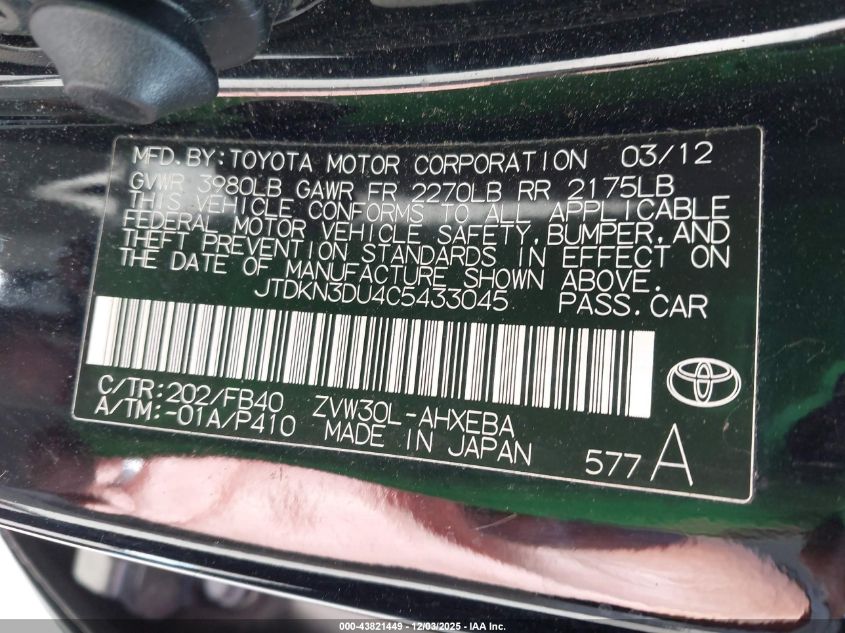 Цвет ЧерныйЦилиндры 4Привод Передний приводVIN JTDKN3DU4C5433045Состояние Заводится и едет (проверено)Повреждения Передняя или задняя AutoRIA