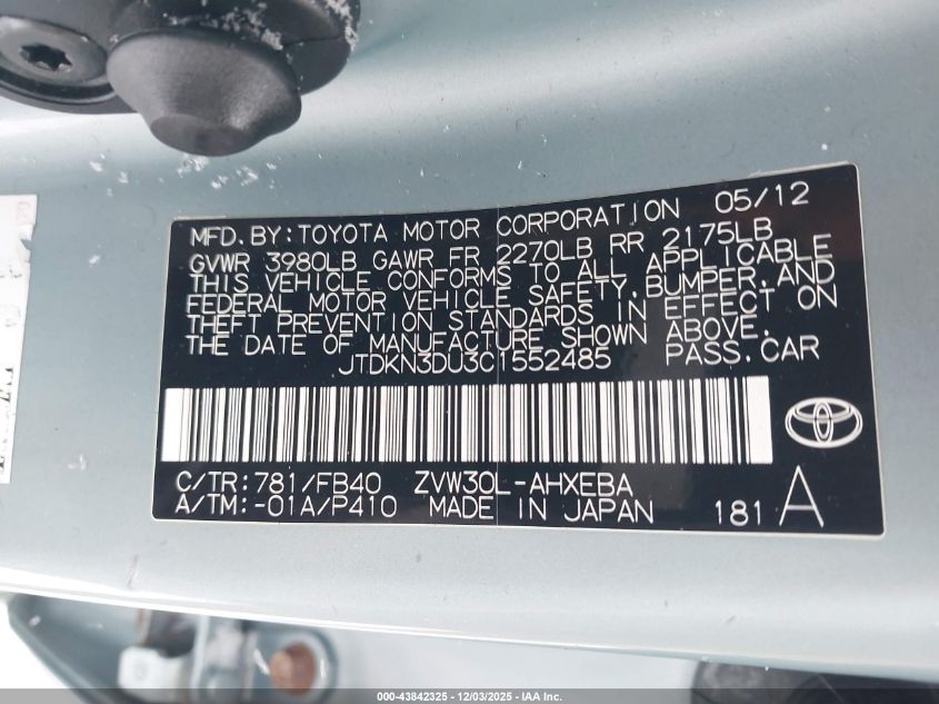 2012 TOYOTA PRIUS 2012 року Гибрид, 1.8, Передний привод, vin - JTDKN3DU3C1552485 из США