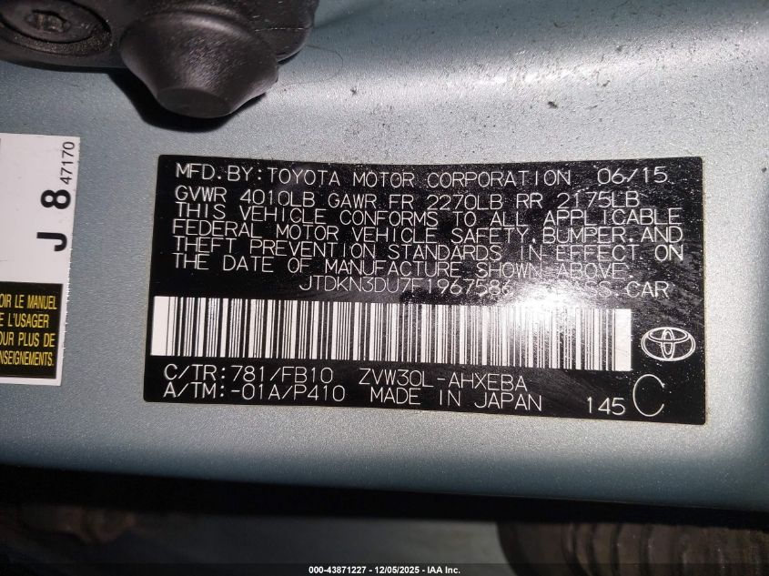 2015 TOYOTA PRIUS 2015 року Гибрид, 1.8, Передний привод, vin - JTDKN3DU7F1967586 из США