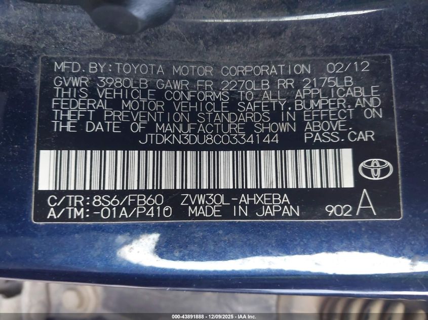 Цвет СинийЦилиндры 4Привод Передний приводVIN JTDKN3DU8C0334144Состояние СтационарноПовреждения Передняя или задняя AutoRIA