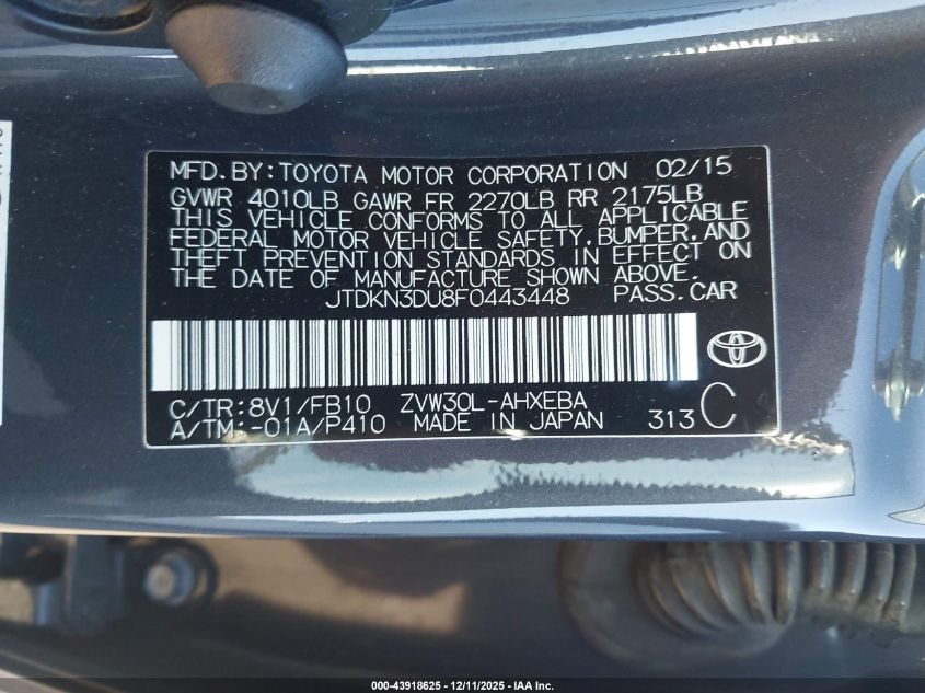 2015 TOYOTA PRIUS 2015 року Гибрид, 1.8, Передний привод, vin - JTDKN3DU8F0443448 из США