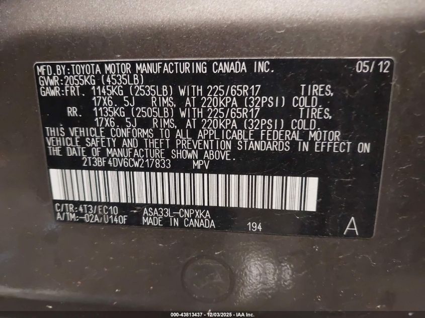 Цвет СерыйЦилиндры 4Привод Полный приводVIN 2T3BF4DV6CW217833Состояние Заводится и едет (проверено)Повреждения Правая сторона AutoRIA