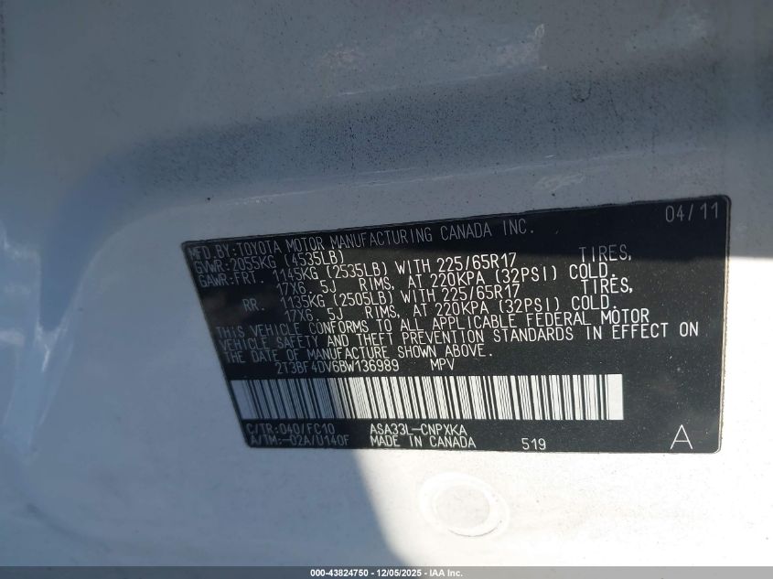 2011 TOYOTA RAV4 2011 року Бензин, 2.5, Полный привод, vin - 2T3BF4DV6BW136989 из США