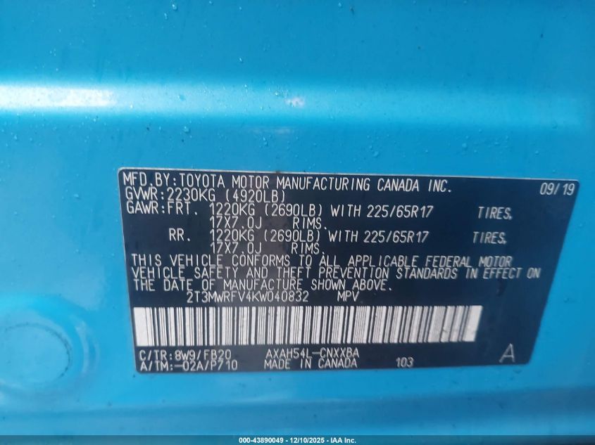 2019 TOYOTA RAV4 HYBRID 2019 року Гибрид, 2.5, Полный привод, vin - 2T3MWRFV4KW040832 из США
