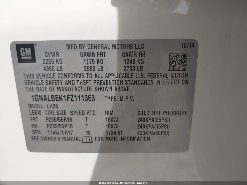 2015 CHEVROLET EQUINOX 2015 року Бензин, 2.4, Передний привод, vin - 1GNALBEK1FZ111363 из США