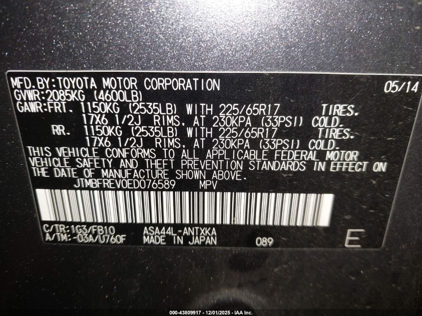 2014 TOYOTA RAV4 2014 року Бензин, 2.5, Полный привод, vin - JTMBFREV0ED076589 из США
