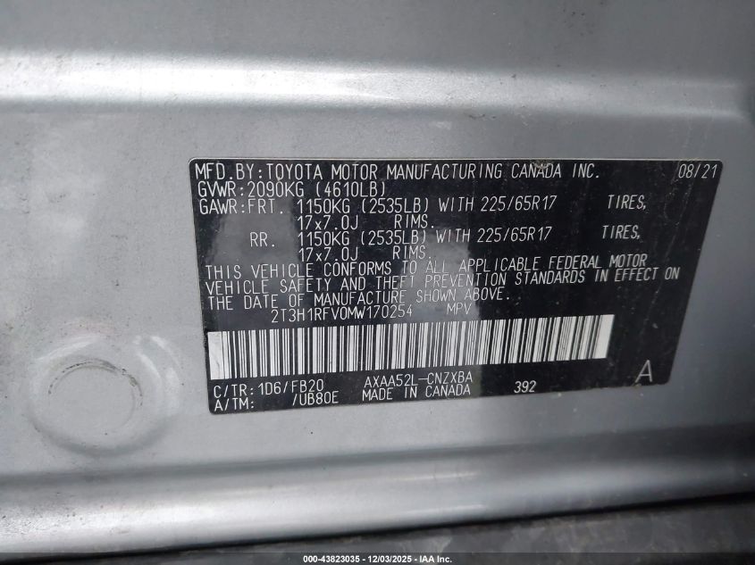 2021 TOYOTA RAV4 2021 року Бензин, 2.5, Передний привод, vin - 2T3H1RFV0MW170254 из США