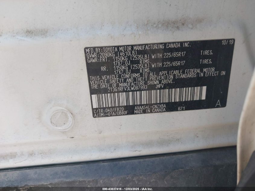 2020 TOYOTA RAV4 2020 року Бензин, 2.5, Полный привод, vin - 2T3G1RFV3LW087993 из США