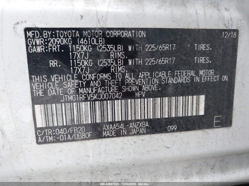 2019 TOYOTA RAV4 2019 року Бензин, 2.5, Полный привод, vin - JTMG1RFV5KJ007042 из США