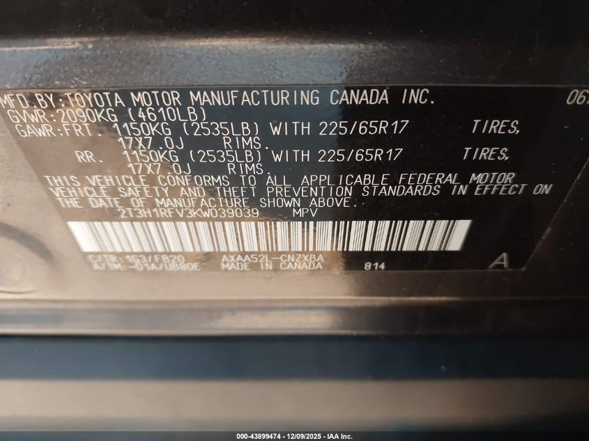 2019 TOYOTA RAV4 2019 року Бензин, 2.5, Передний привод, vin - 2T3H1RFV3KW039039 из США